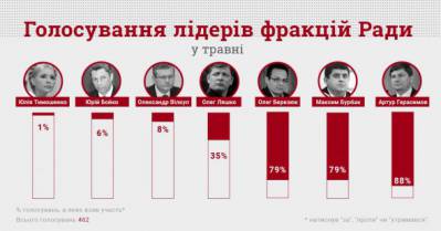 Також низькі показники голосувань у "радикала" Олега Ляшка. Він взяв участь в 35% голосувань (166 із 462). Політик не голосував за закон щодо трансплантації органів, але підтримав в першому читанні законопроекти про заборону пальмової олії та діяльності Держбюро розслідувань. Був зареєстрований на восьми засіданнях.